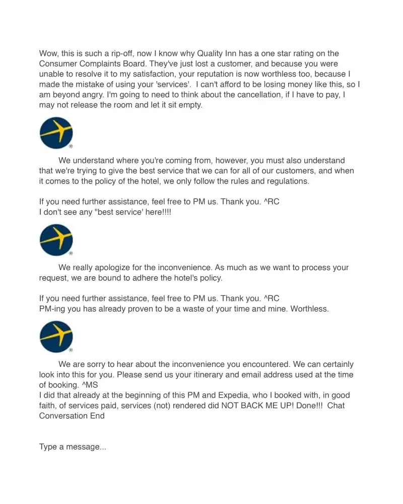 On April 4, I went thru Expedia and booked rooms thru Quality Inn in Granbury and Waco (Bellmead) Texas. About 3 days later I realized that I wouldn't be driving back there due to a series of thunderstorms, so I went onto the Expedia website and easily cancelled my 5-night stay in Granbury. Next I went to the email itinerary for the Waco property, and couldn't see how to cancel, after about 15 minutes I saw a number to call at the hotel, they said I had pre-paid and that I couldn't cancel. I said "Whhaaaatttt?" I didn't realize I had done anything differently between the two reservations, but the guy said I needed to email/call Expedia because it was a 'third-party thing' and they would consider the refund/cancellation. So then I emailed Expedia, and they called me back and I spoke to 'Joyce' (very hard to understand, East Indian I believe) who said I'll contact the hotel and I waited maybe 30 minutes on hold, when she came back she said they needed to contact a supervisor in order to authorize the refund, but he wasn't in, and they would contact me in 24 hours, which they never did. So this morning I looked to see the best ways to file a complaint with Expedia and they said Facebook, which I did. They replied in a minute and asked that I PM them, so I did, they got my itinerary number, [protected], Conf # [protected] and 'pretended' to help, they called Quality Inn and spoke with Brian who said no refund. Expedia pretty much said they have to go with the "rules and regulations" of the hotel, really? by doing business with each other, aren't they actually 'partners'-don't partners work together to help each other's business? This is actually consumer fraud by Expedia AND Quality Inn, I'm sick of it. Expedia should NOT make it so easy to make such a mistake, my trip was never for sure, so I never would have pre-paid and put myself in this infuriating predicament, it apparently was too easy to do. Please help. Expedia is headquartered in Bellevue, WA, 98005, Expedia.com