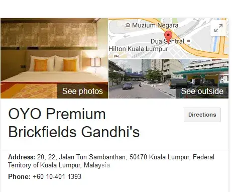 Incidentally ‘Premium Brickfields Gandhi’s Kuala Lumpur’ Does Not exist the picture OYO and you use the staff at the Hotel Lotus tracked down was called once “Royal ...†something, and Your Website and Google search still use this Bogus hotel of ‘Premium Brickfields Gandhi’s Kuala Lumpur’ and the False pictures of another hotel to sell this Bogus hotel that simple does not exist as ‘Premium Brickfields Gandhi’s Kuala Lumpur’!