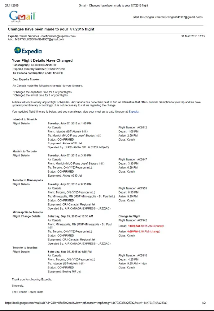 I bought a plane ticket from Air Canada over Expedia. My flight was going from Istanbul to Miniapolis with Toronto connection. But I wasn't let into the plane by the Air Canada's authorized personel because I didn't have Canada Visa. I missed my flight. I contacted to Expedia and they converted my ticket amount into flight points. I demanded refund. I wrote a letter, email and I called Expedia's Istanbul office but I haven't received any feedback. I want my money back. When I arrived to USA after I bought another ticket, I was told by the authorities that a visa can be bought easily from the visa section of the airport when entering frm Canada to USA. But I wasnt even informed about this by Expedia. I can not contact to anybody from this company. My ticket is in the attachment.