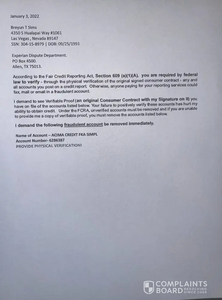 This complaint is for Experian regarding the FRAUDULENT ACCOUNT Acima Credit FKA Simple (account number 6286387) that has been placed on my credit report illegally. I have never done business with (Acima Credit) and this account must be removed because it is made my life extremely difficult. By being stuck with higher interest rates, fewer loan options, and also hindered my housing. I need it removed immediately. I have contact Experian 30 days ago to remove this account and Experian have no responded back to me about this matter that holding me back to prosper in my life that should not be there in the first place. Legally they are obligated to respond within 30 days and Experian have not done so. The Acima account in question have been opened around the time I lost my wallet and many other things of identification. This is Identity Theft. I would highly appreciate if BBB assist in getting this fraudulent account removed so I can get back to my life as it were before the traumatic incident.
