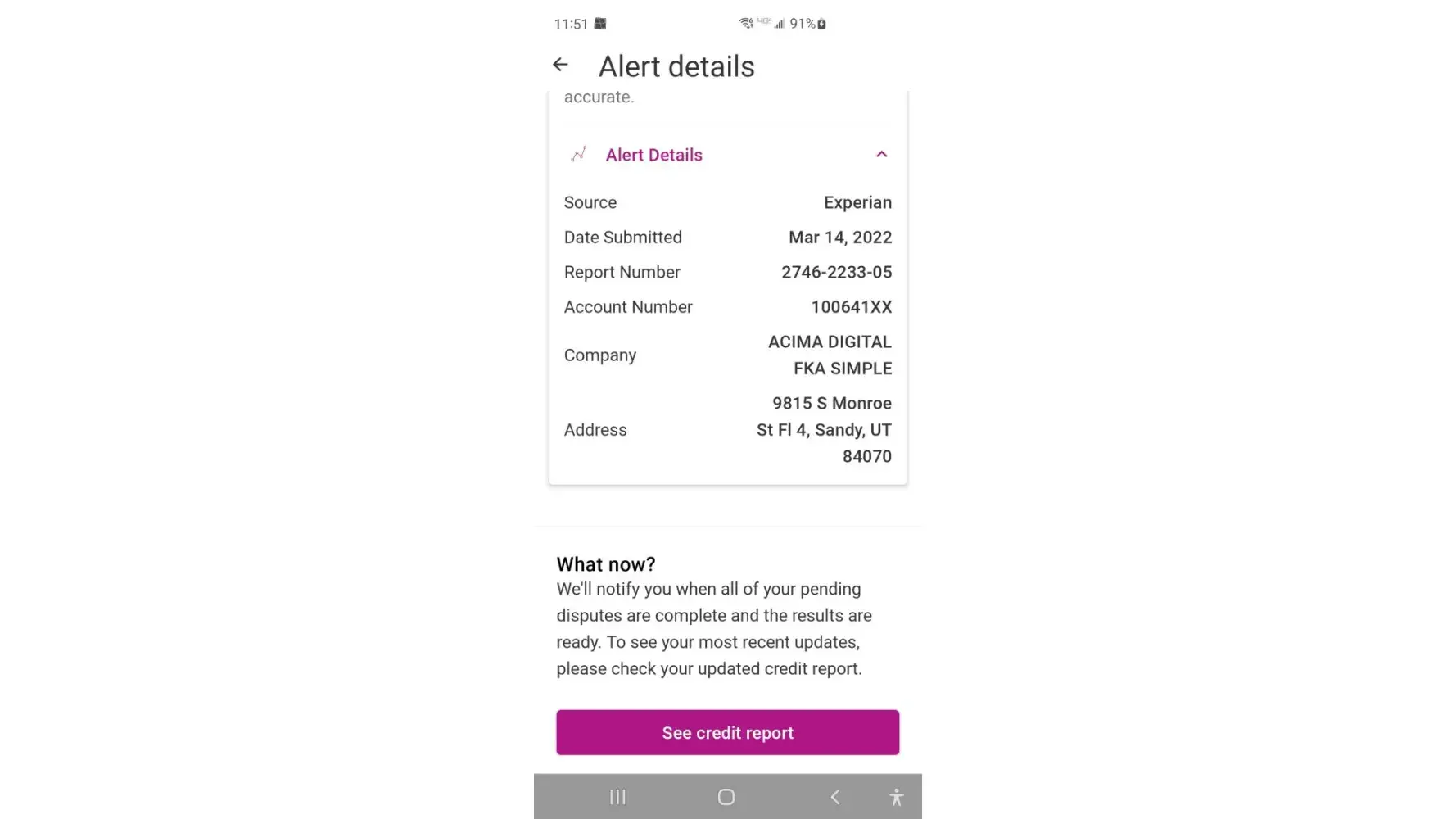 Experian Acima credit fka simpl / credit reporting account