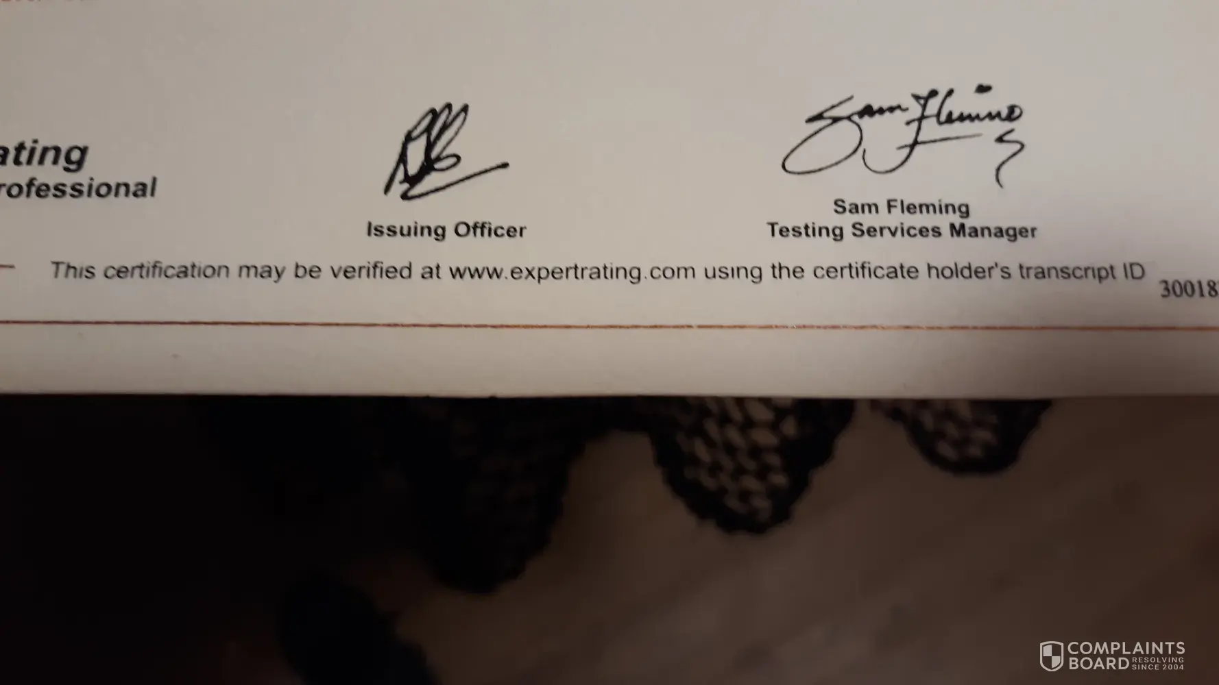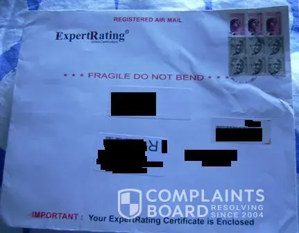 I received my personal training certificate from ExpertRating ! I sent them a picture and they still denied it came from them. It clearly states ExpertRating on top. I have been working with customers thinking I am certified and now I am not. What to do next I am not sure but I definitely will be looking into solving this matter. That is the true definition of a scam right there .