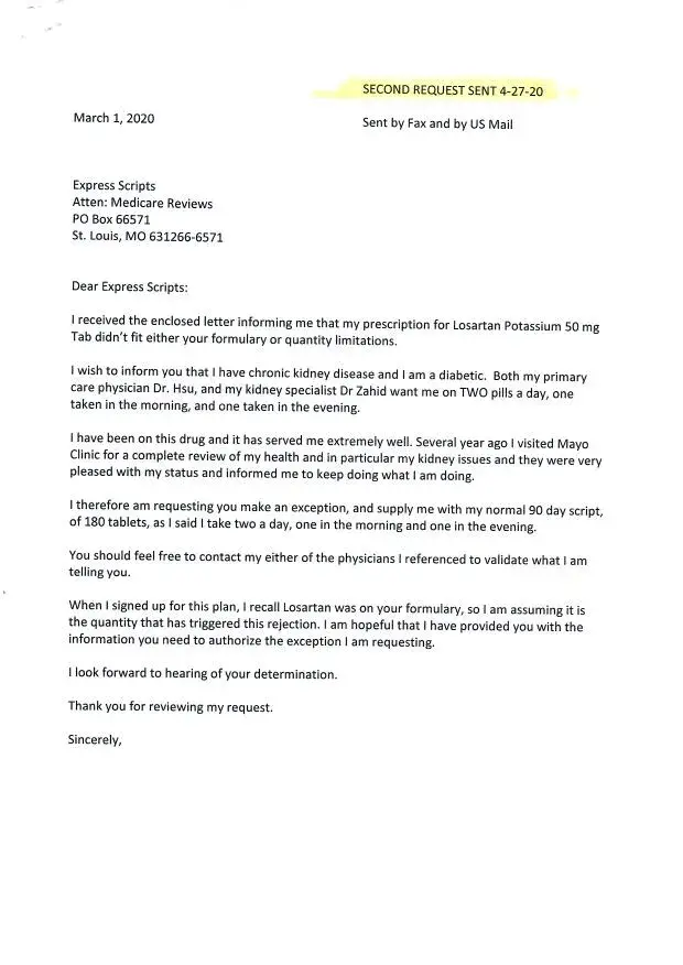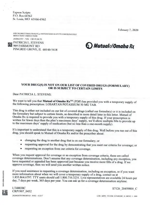 The formulary list Losartan as a covered drug with limits on qty. I take 2 per day at 50mg. They continue to harass my doctor for an exception as to why it can't be 100 mg once a day. (90 pills for 90 days instead od 180 pill for 90 days. Why should I have to break a pill to comply with how I am supposed to take it? I have written two letters to their Medicare Review Dept per their instruction and also faxed them to the number they provided. They now claim never having received them.. It's a lie. Can you help me.