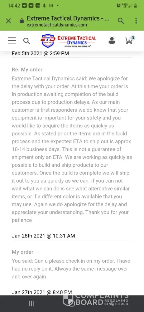 Extreme Tactical Dynamics said: Thank you for contacting our sales department however they are unable to assist with order status. Sorry for the delay on your order. We are experiencing unpredictable volume increases and limited employee availability due to the impacts of Covid 19. We appreciate your patience and are working as quickly as possible to process and ship all orders. Once your order is shipped you will be notified via email with the tracking to let you know your package s on the way to you. ETD Staff