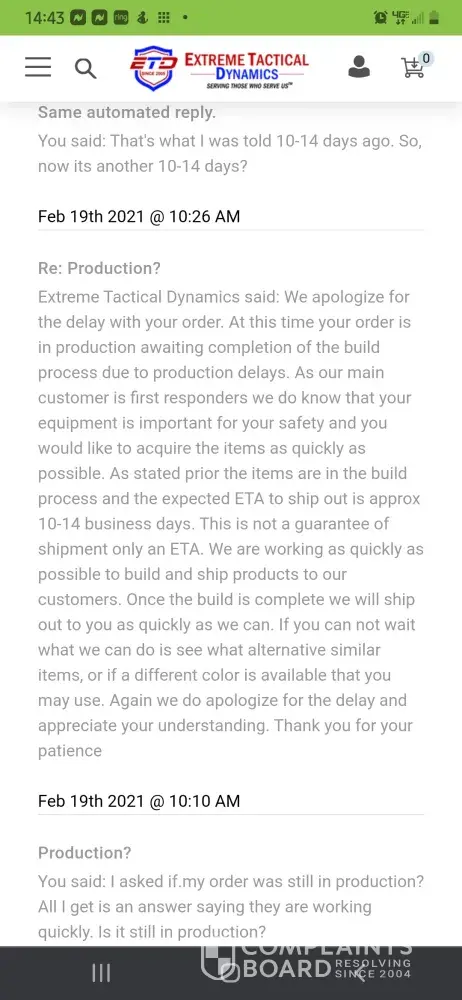 Extreme Tactical Dynamics said: We apologize for the delay with your order. Unfortunately, we have no control over the time frame for the receipt of the parts we have ordered. The parts are in transit to us just very slow in receiving them due to delays with shipments coming in from overseas at this time. I can not give you an exact date as we contact our shipping providers daily and can not get an exact date from them. I can provide you an estimated time frame of 10-14 business days. This is not a guarantee of shipment just an estimate. I sincerely understand your frustration and we are doing everything we can to get our parts so we can provide our customers with the items they need. Please let us know how you would like to proceed. Tks