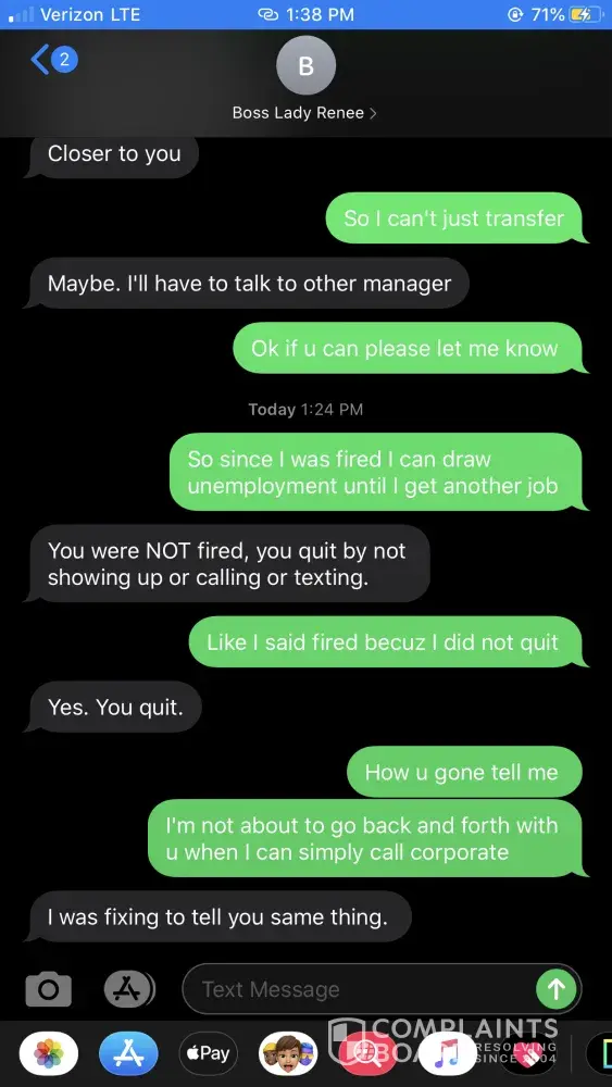 I worked at Exxon for a little over a month and within that period of time I dealt with a lot of disrespect from my manager a lot of being pushy and forthcoming and very brutally honest I would like for her to see that her actions are not necessary or the job to be done she also fired me Because I woke up late and she's now trying to force me to say that I went so I wouldn't be able to draw unemployment from her firing me.