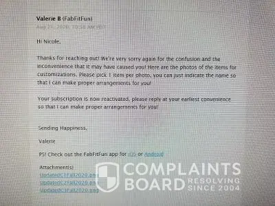 I left a lengthy and glowing review for the FabFitFun Customer Care Department -for Viea in particular- for helping me