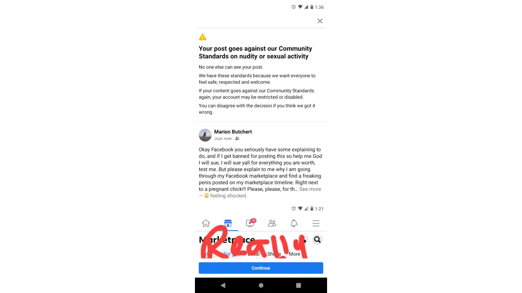 I was coming through marketplace looking for building material, I typed free in the search bar and begin my search. As I scroll through my Facebook marketplace feed I got an advertisement for CBD the displayed two pictures of the men's private area. I screenshot it tried to get answers from Facebook and got banned. I'm extremely upset that something like that would come across my marketplace feed. I've never searched for enhancement drugs of any sort so there is absolutely no reason why that showed up on my feed. I do not appreciate it and it is absolutely disgusting that that would come across a shopping feed, and I want answers as to why it was there in the first place. How can you allow something like that and then ban me for something ya'll allowed in the first place. How dare y'all stick other people with double standards. I only shared what y'all shared with me back to y'all to get answers. Absolutely disgusting in a very low way to operate what's considered a business. And just imagine thank God my grandchildren are not allowed to have Facebook or any kind of social media site. But I do like to let my grandchildren pick out items off of marketplace and thank God I was not with one of my granddaughters when that came across my marketplace feed. Could you imagine shopping for toys or clothing items for you, your child, or your grandchild and all of a sudden you're just getting pictures of people's private parts as advertisements? Absolutely disgusting and I want answers.. m.r. [protected]@gmail.com