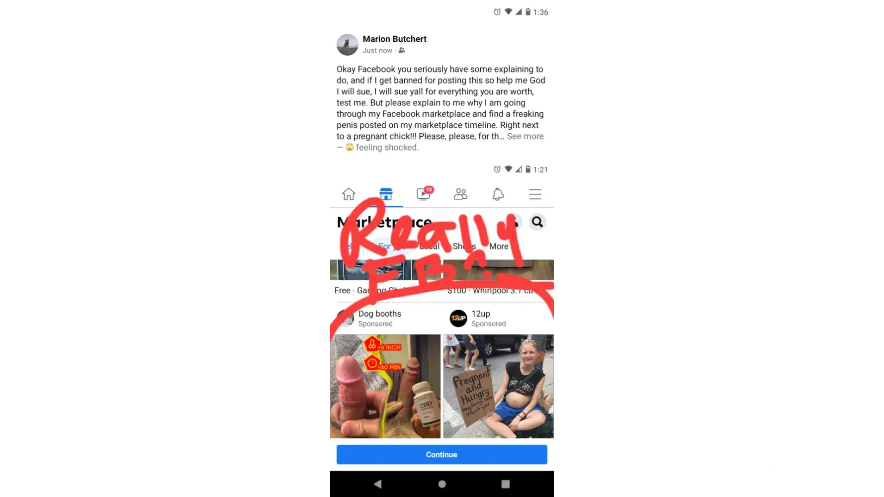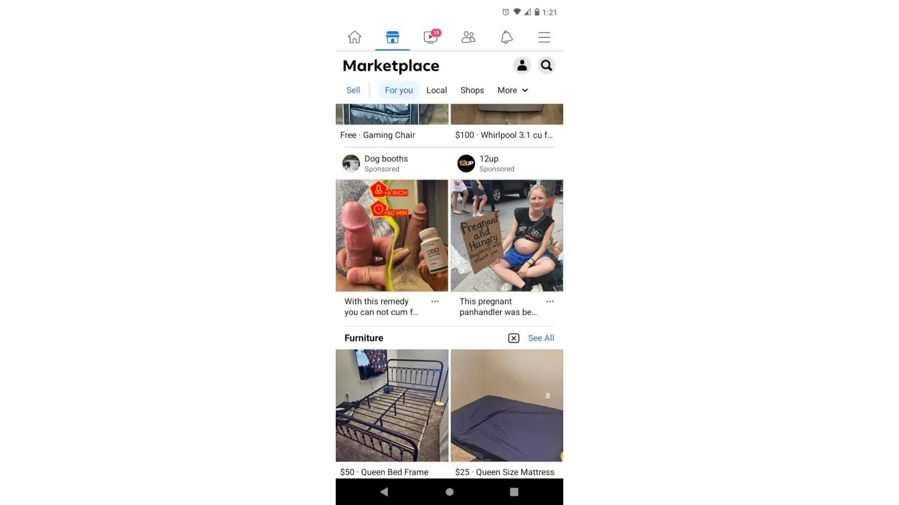 I was coming through marketplace looking for building material, I typed free in the search bar and begin my search. As I scroll through my Facebook marketplace feed I got an advertisement for CBD the displayed two pictures of the men's private area. I screenshot it tried to get answers from Facebook and got banned. I'm extremely upset that something like that would come across my marketplace feed. I've never searched for enhancement drugs of any sort so there is absolutely no reason why that showed up on my feed. I do not appreciate it and it is absolutely disgusting that that would come across a shopping feed, and I want answers as to why it was there in the first place. How can you allow something like that and then ban me for something ya'll allowed in the first place. How dare y'all stick other people with double standards. I only shared what y'all shared with me back to y'all to get answers. Absolutely disgusting in a very low way to operate what's considered a business. And just imagine thank God my grandchildren are not allowed to have Facebook or any kind of social media site. But I do like to let my grandchildren pick out items off of marketplace and thank God I was not with one of my granddaughters when that came across my marketplace feed. Could you imagine shopping for toys or clothing items for you, your child, or your grandchild and all of a sudden you're just getting pictures of people's private parts as advertisements? Absolutely disgusting and I want answers.