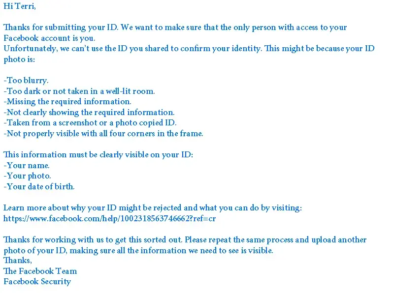 The link was very strange. I have done a lot of graphic design work and am very proficient in Photoshop. I scanned and cropped my driver's license at 300 DPI and the finished image size was about 600 pixels wide. It was clear and readable. Nope, not good enough and I was told to do it over. The link from Facebook wanted an image that was 1500 pixels wide. I went back to Photoshop and resized the scanned image and resent it. Nope, not good enough. I am very good with Photoshop. Both images were clear and readable. Nope, still not good enough. Facebook sent a list of requirements for the image. Again, I am very proficient with Photoshop and I know both images were readable.