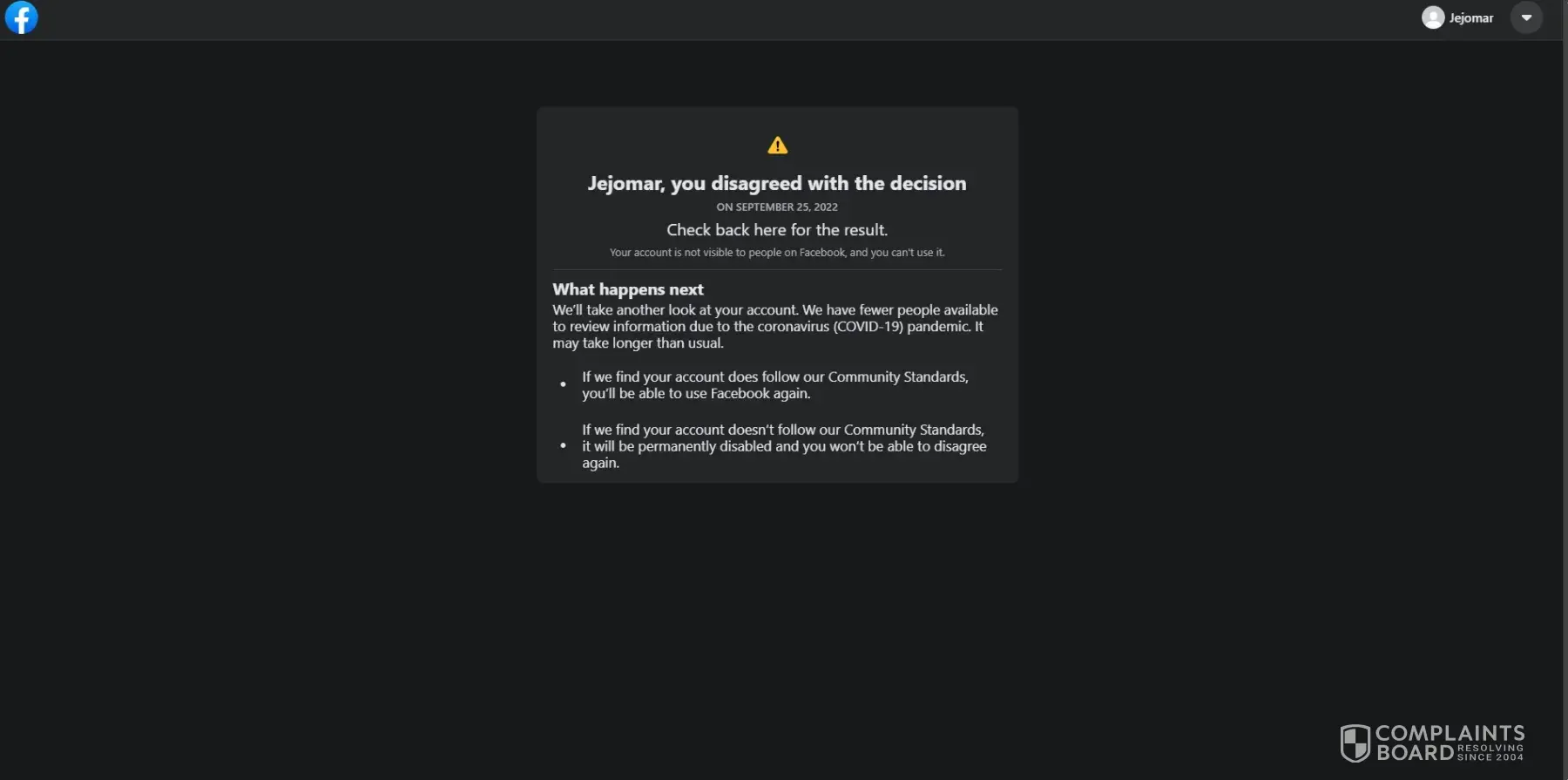 9/29/22 Facebook just closed my account. They said I was ineligible for an account. I have my account for 11 years, no suspensions, no rule breaking and follow all the guidelines. I disputed the decision through the "help desk" and received a response saying due to Covid they don't have enough help to review. Would like to have my account reinstated.