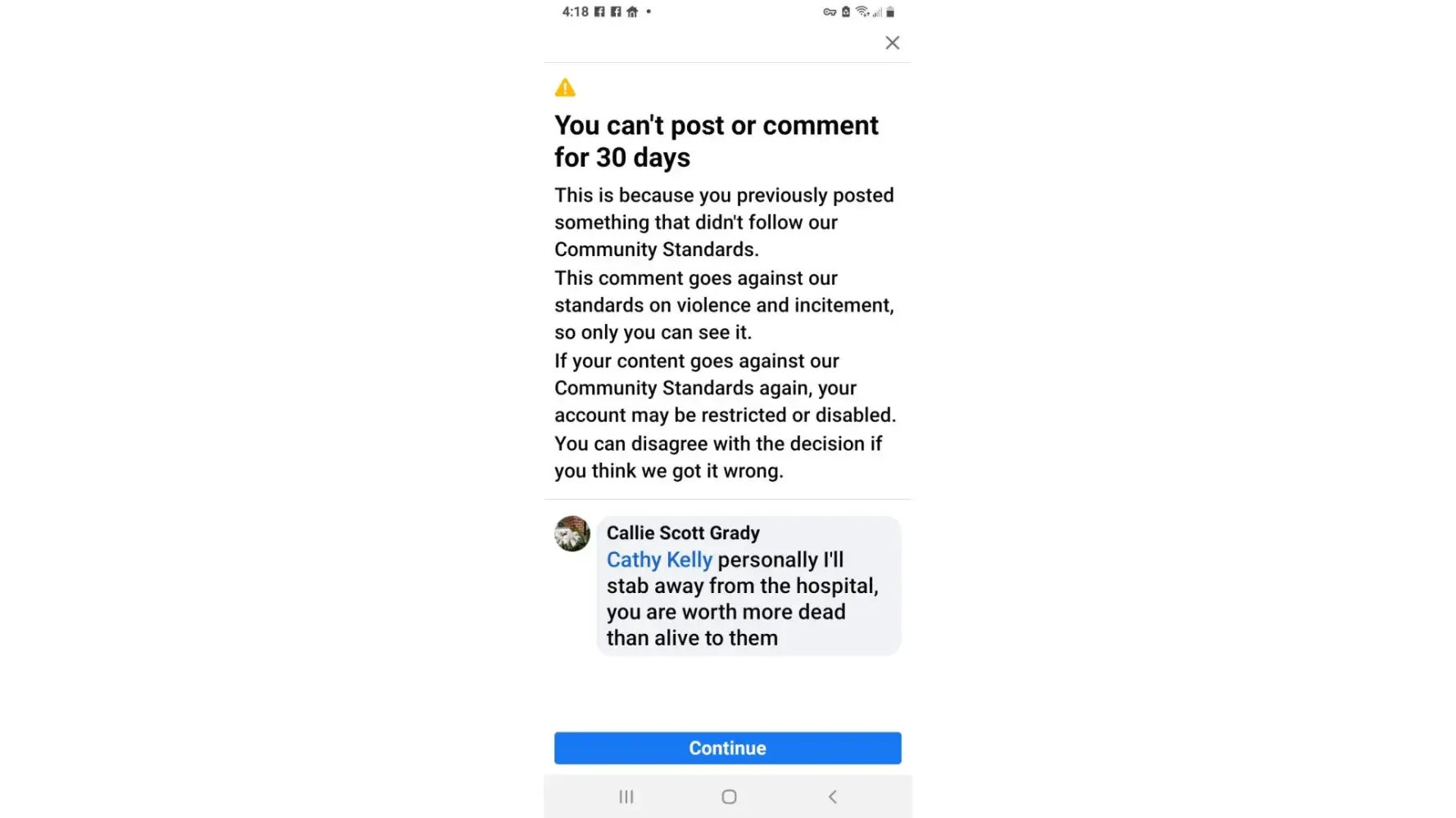 I'm so upset this is the 3rd time they have suspended me for a voice to text error. All because I didn't proofread what I was posting they said I was being violent there's nothing wrong with not wanting to stay at the hospital.
