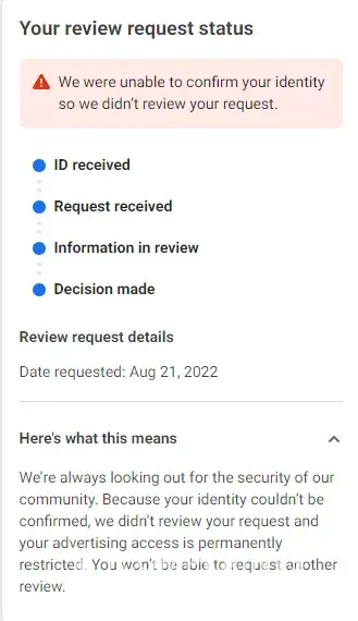 My Business Account was restricted. It did not tell me specifically why. I requested it be reviewed and was prompted to upload my ID to authenticate who I am. I uploaded my Driver's License. Within hours I received notice that my account was PERMANENTLY restricted and I could not request another review. And the reason... because they could not verify who I am. No phone # to call, no chat to speak thru, no email address to send to... The Helps menus don't address this and figuring out where to even go to see what FB says about this situation puts you through an unending maze of pages with no satisfaction. Terrible and awful communications protocol. Where do I go from here? Where can I even get a question answered?