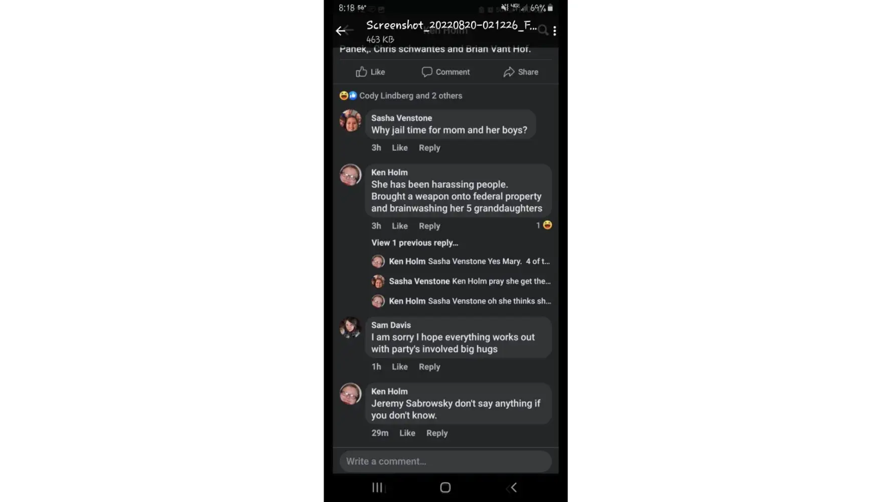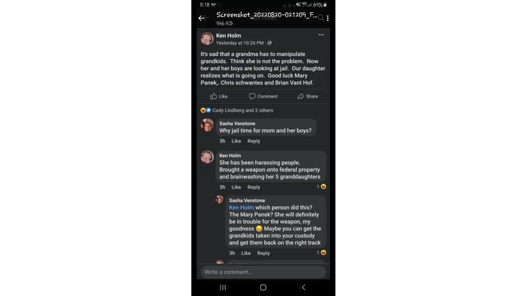 I have been harassed by Ken Holm now foe a few years and it appears that Facebook does nothing to stop his lies, his slandar and him accusing me and my sons of stuff. He has several facebook pages and is linked to his wife Jennifer holm. He tags her account to spread his lies and threats. He has lived in Holdingford, OK and who knows where else.