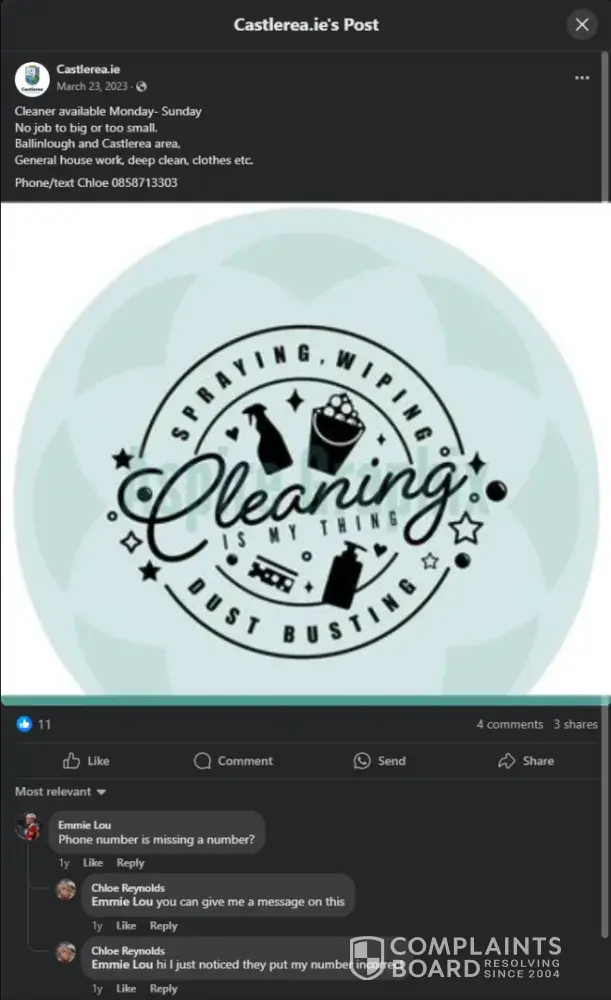 Emmie, my friend and also a Facebook user, receives a friend request from a profile claiming to be a certified babysitter and cleaner. You can view the Facebook post [here](https://www.facebook.com/castlerea.ie/posts/pfbid02mTj3kcZkWZ99ccsvuJHia2QL7xrSwsCfzBPPno6khvwC4MgJu3cpKGsaitgRWc4tl).