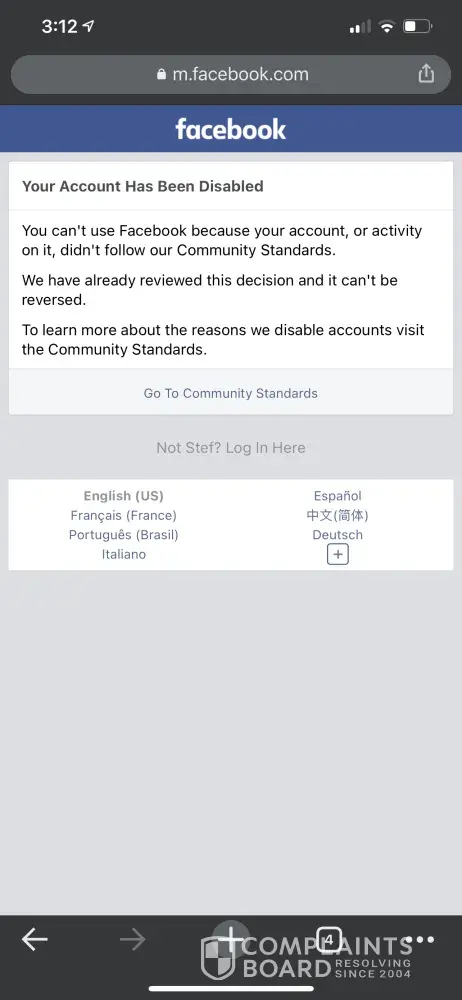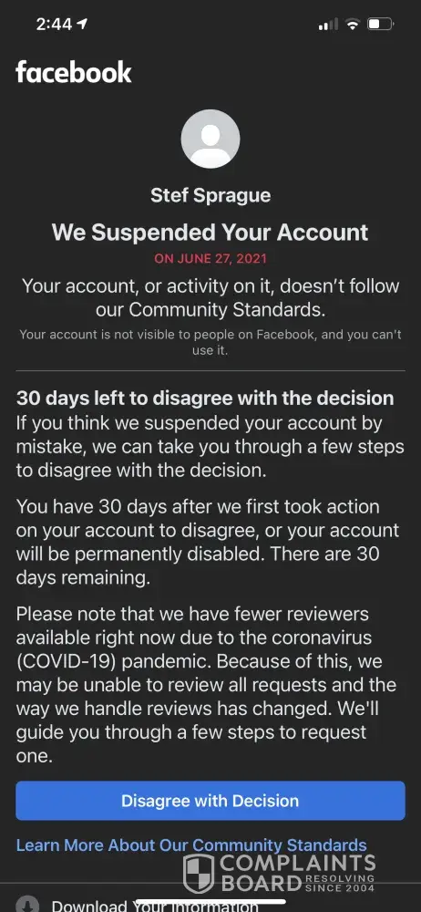 Facebook is very concerned with community standards yet allows virtually ZERO options to dispute if you disagree with a ruling. You can click that you disagree but it will not change the result of an account ban.
