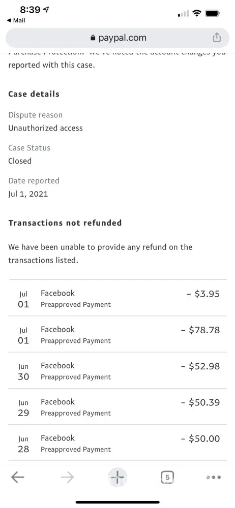 My account was hacked on the 6/24/21. An isis flag was then put up as my profile picture. I lost all control over my account and then it was permanently banned on 6/27/21 after I asked for my account to be reconsidered…after putting in my real id …but it was shut down with no reversal on 6/27/21. I come to find out on 7/1/21 that my paypal account has been charged by facebook charges on 6/28, 6/29, 6/30/, and two on 7/1! I reported it unauthorized on paypal through their resolutions center, and they came back with a verdict that it was authorized by me. An agreement in august 2015! It was dormant up until I was hacked and no longer allowed to log in.