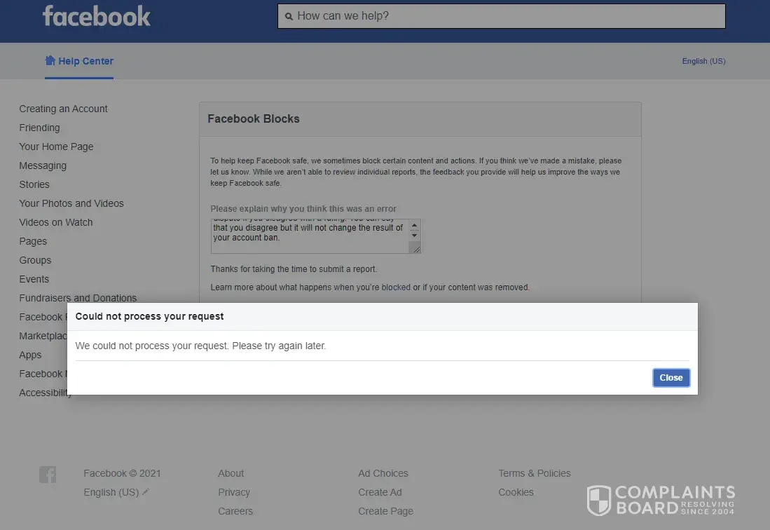 Even when you want to click help on the community pages of Facebook you are blocked from posting. You are given a link to explain why it is a mistake but that link does not work.