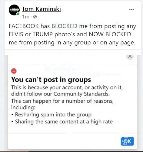 Facebook has BLOCKET me from Post Elvis Photo's on Elvis Groups and Pages and Political Pictures of President Trump on two Political pages.