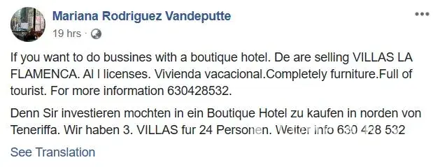 Villa la flamenca located in tenerife (spain) is a scam. It's not a hotel and it's not a vacation rental. The person posting fake pictures of this place online to lure victims is a belgian who resides in the canary islands. Her name is mariana rodriguez vandeputte.