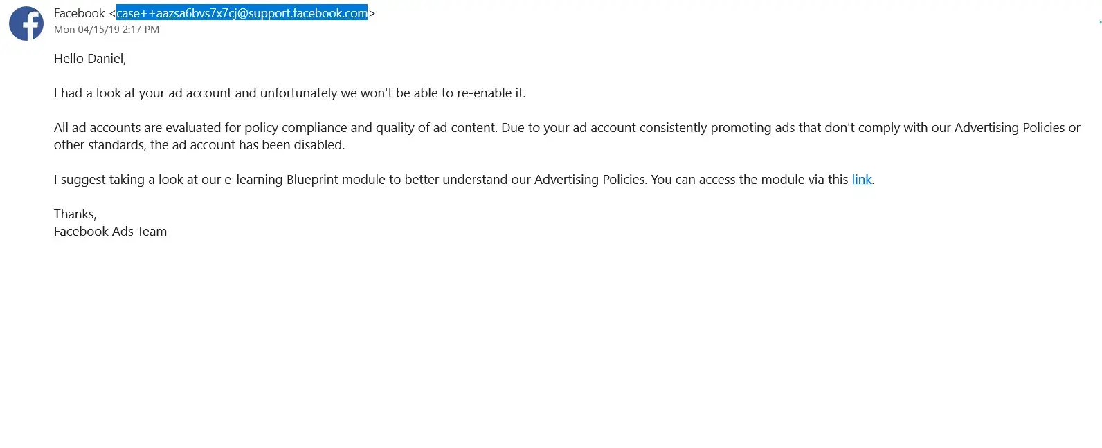 I run a FB page regarding my business which are 2 Residential Care Facilities for the Elderly (RCFE) FB page EscondidoSeniorCare//Daniel Malchow DC. Told account was disabled stating I consistently promoted ads that don't comply w/ Ad Policies and unsafe. However, I was charged $54.09 charges this month for ads...yet they disabled my ads. I inquired and have been told 4X now my ads won't be re-enabled. I use no vulgar language, porn, racial slurs etc. It's about taking care of seniors citizens... Here is contact info from FB ads team email: case++aazsa6bvs7x7cj@support.facebook.com. They won't explain how my ads are unsafe or offensive and they won't address my concern of why they charged me when I haven't placed an ad for several months... I've been unable to remove my credit card from FB and I don't want it charged any more. This is all in the past 14 days. I feel disabling my FB account is dicriminatory b/c they would not explain what was offensive. Attached copy of CC charges and 2 email contents.