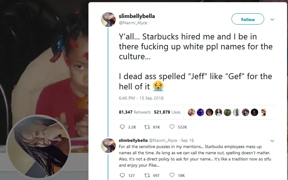 Here is what she says "Y'all... Starbucks hired me and I be in there [censored]ing up white ppl names for the culture... I dead [censored] spelled "Jeff" like "Gef" for the hell of it"