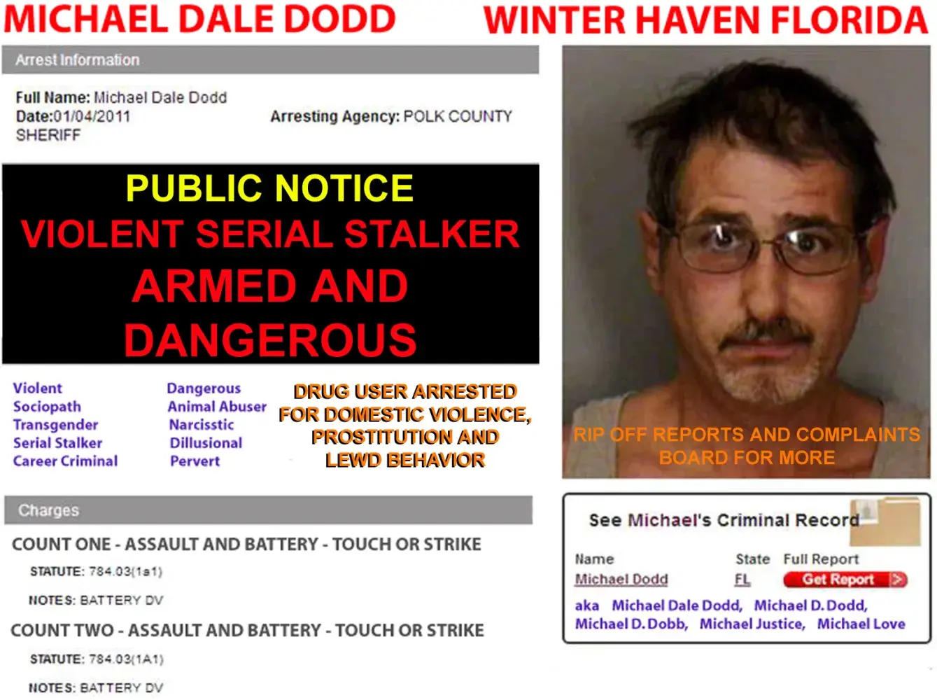 Michael Dale Dodd claims to be an expert on healthy canines when in fact his intentions are to control every dog group and their members - on Facebook. He once said "small dogs are chick magnets" which is why he got on facebook to begin with. Since he was caught stealing funds he raised to help one of his members, he has spent four years slandering anyone that questions him or refuses to give in to his sick demands to control them, or their group, charity or rescue. He's gone as far as attacking families, neighbors, jobs and landlords. Simply do a search on Michael Dale Dodd, Michael D. Dodd of Winter Haven, Florida, especially on scam report. You can see for yourself what he does. Then check the groups you are in on facebook. In this link is a list of groups he adds people to without their knowledge or consent. If you've been added to one of these, quit, block and run. This pig is dangerous. He's a homophobic, diagnosed narcissistic sociopath, bigot, thief, liar, animal abuser and a violent career criminal. He is anything BUT knowledgable in the care of canines - and in fact has been fined, ticketed and arrested for their abuse. He will go on the internet and plagiarize an authors research to make it look like his own, all part of the "front" he puts on to give himself more credibility. Most recently he had 20 dogs removed from his trailer for hording and was ordered by a judge to get an education on their proper care before he could own another one. Copy and paste this link into your search bar to see who he and his little troll buddies really are. If you pay attention to this thread/complaint, watch Dodd or one of his aliases, fill it with more "proof" of slander and lies against people, me included. Not one attempt will be made to justify his own behavior. Because he cant. He's sick. Do your homework please! Research! Do not take the word of a very disturbed internet troll! Then share and be aware! And run as far away from him as you can.