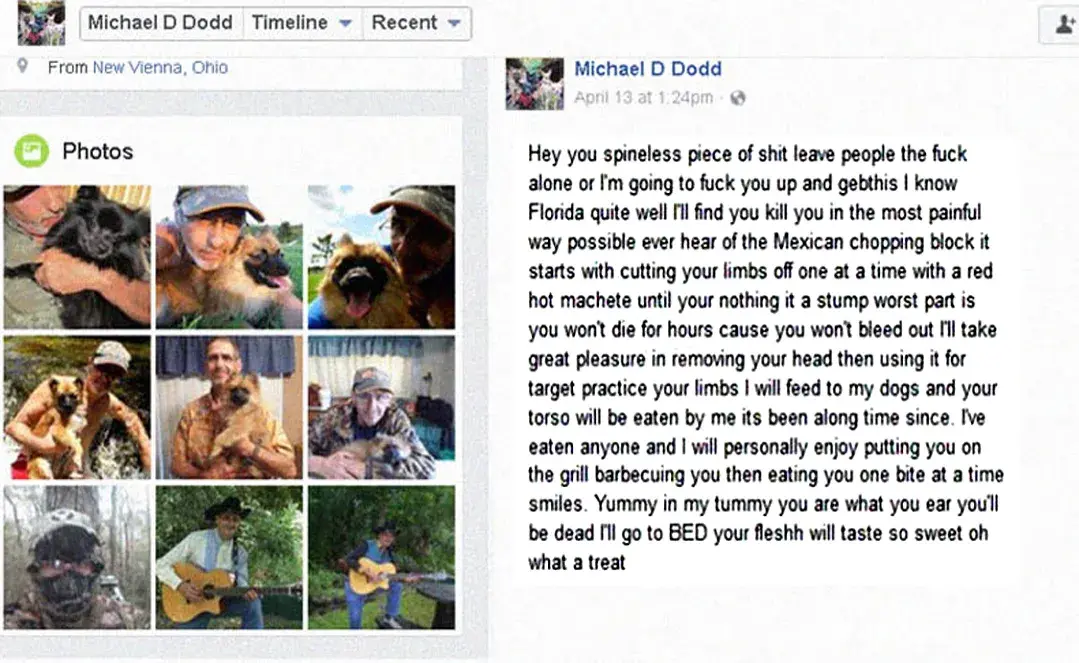 Michael D Dodd also appears under name Michael Justice. ... here as this person has threatened me to come to my house and hurt me if I tell people the truth or I report her. ... All is screenshot and saved, try to figure out who is doing it. ... @Michael Dale Dodd Whereever there is a war - your are ALWAYS in the middle of it.