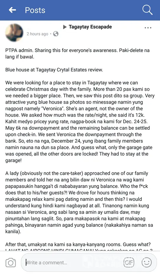 We were looking for a place to stay in Tagaytay where we can celebrate Christmas day with the family. More than 20 pax kami so we needed a bigger place. Then, we saw this post dito sa group. Very attractive yung blue house sa photos so minessage namin yung nagpost namely "Veronica". She's an agent, not the owner of the house. We asked how much was the rate/night, she said it's 12k. Kahit medyo pricey yung rate, nagpa-book na kami for Dec. 24-25. May 6k na downpayment and the remaining balance can be settled upon check-in. We sent Veronica the downpayment through the bank. So, eto na nga, December 24, yung ibang family members namin nauna na dun sa place. And guess what, only the garage gate was opened, all the other doors are locked! They had to stay at the garage!