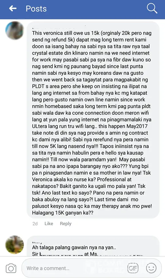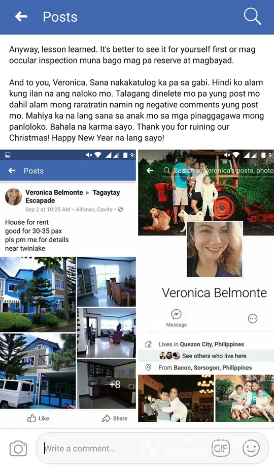 And to you, Veronica. Sana nakakatulog ka pa sa gabi. Hindi ko alam kung ilan na ang naloko mo. Talagang dinelete mo pa yung post mo dahil alam mong raratratin namin ng negative comments yung post mo. Mahiya ka na lang sana sa anak mo sa mga pinaggagawa mong panloloko. Bahala na karma sayo. Thank you for ruining our Christmas! Happy New Year na lang sayo!"