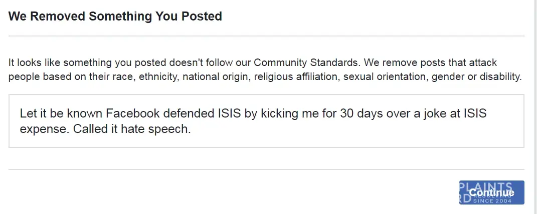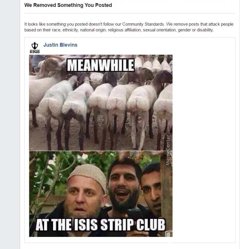 My most recent events have irked me the most. I made a joke at ISIS expense nothing bad you know that sheep meme meanwhile at an ISIS strip club I shared it 30 days banned. A few minutes ago I called someone stupid due to us debating he had no evidence and then he contacted me said you blocked me I win when he blocked me I have the evidence for it. 30 days banned.