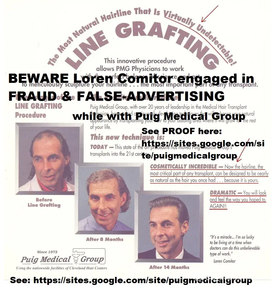 beware - for reasons described below, loren comitor is a depraved individual with no morals or ethics and engaged in fraud & false-advertising while working with dr. carlos j puig and puig medical group (pmg, aka cleveland hair centers); see proof in these google websites: