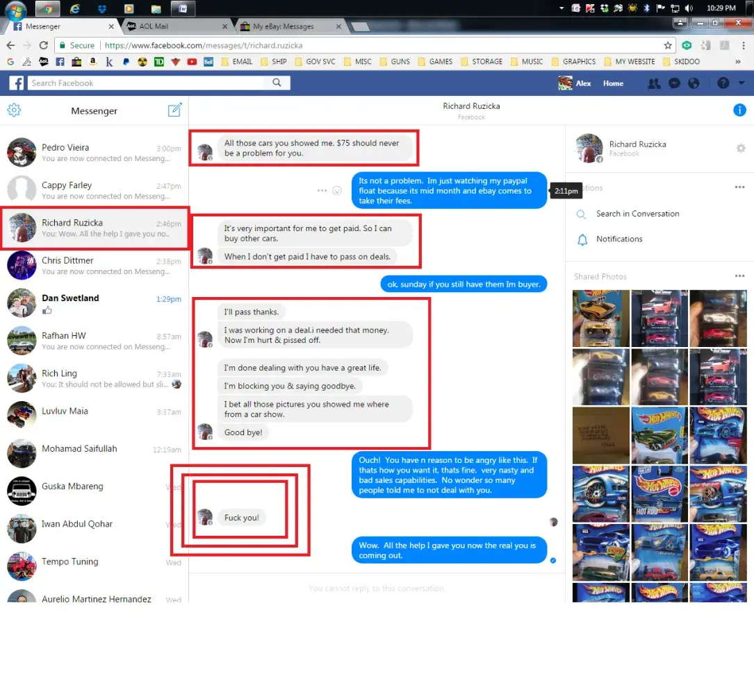 After I stayed firm on paying Sunday, he went completely ballistic, insulted me with profanity and started to further make up lies in his facebook and of course block me like the coward he is, so that I could not defend myself. He has further made libelous comments against me for everything that he caused. I intend on filing complaints with BBB in Omaha, and with other online orgnizations that defend buyers against fraud. I was warned by many people that Richard Ruzicka has a serious problem with communication and makes demands. I gave him a chance to be fair with me, and he screwed me out of 1.80$ I tried to get him to come clean with Paypal and send me the money and he posted a message on his facebook that he will not refund me.