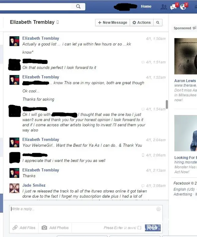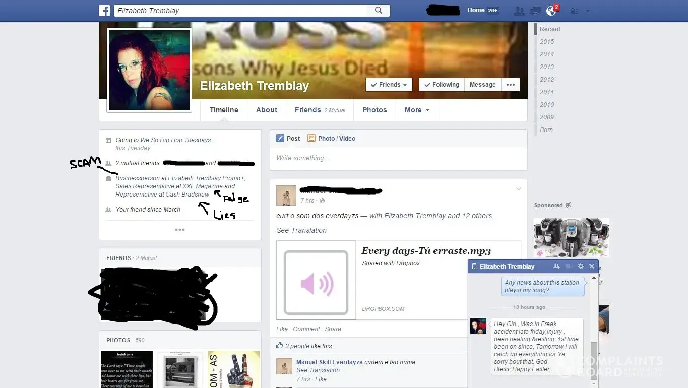Elizabeth was paid 30 on April 2, 2015 For song submission for my artist for online radio airplay. Elizabeth Tremblay failed to deliver any details on what radio station, nor did she give my client an actual date and time for when there would be any radio airplay. When asked for specific details she got defensive and insulted. Elizabeth is not affiliated with any Professional Music Entities On or Offline and she is operating Scams Illegally over the Internet. She is not an A&R, She does not have any degree in what she Falsely represents on her Facebook, Facebook Like Page, nor Her linkedIn account. She has been reported to social media sites online for her Fraudulent Activities. She is Elizabeth Tremblay on Soundcloud, LinkedIn, and Twitter also I would watch out for her because she will trick you into wiring her money then never sending your song to any radio stations that she so call claims she has direct contact with. We're providing screenshots to prove that Elizabeth Tremblay is an Online Scam. Here are some photos provided and make sure any transactions you do are through paypal for anytime of online promotional and advertisement services it's a lot of Scammers Online desperate to take hard working people that make an honest living. What really is sour about this ordeal Elizabeth Tremblay knew my client online a few years prior to my client trusting her to deliver what she advertises online. This Report is made to protect other individuals from making similar mistakes.