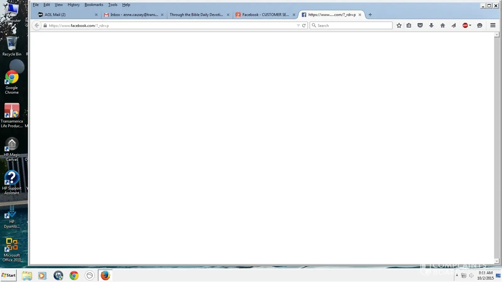 Thankfully, my son sent you an email and you responded so I actually have an email address for you. Since Monday evening, I have been unable to even get on my FB's login page. All I get is a white screen . . . nothing else.