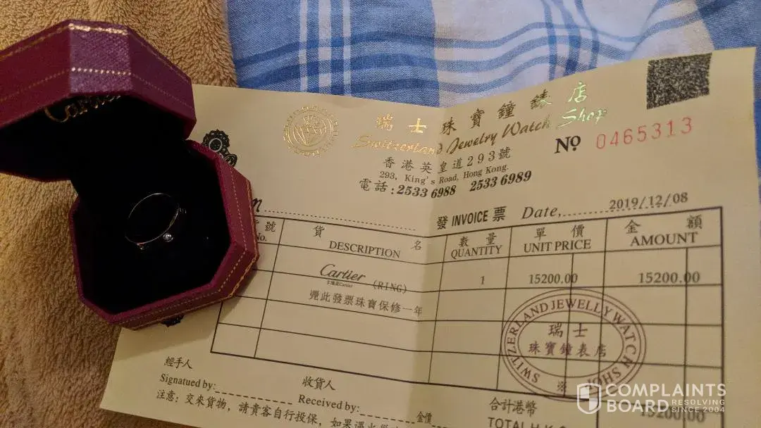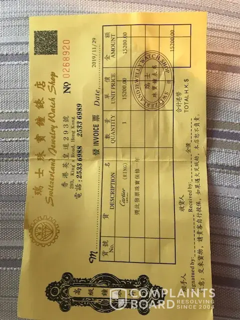 Hi guys, the same happened to me! I got this fake Cartier ring mid December 2020 purchased for $15, 200 at the Switzerland Jewelry Watch Shop in Hong Kong. The phone number is fake and doesn't exist. A friend of mine from HK tried calling the number. I suspected scammers opened up a credit card Online on my name to make this purchase. So far nobody (bank) came forward to ask for money. The receipt looks exactly the same as Ralph Snerd attached. Please let me know if you discover anything else.