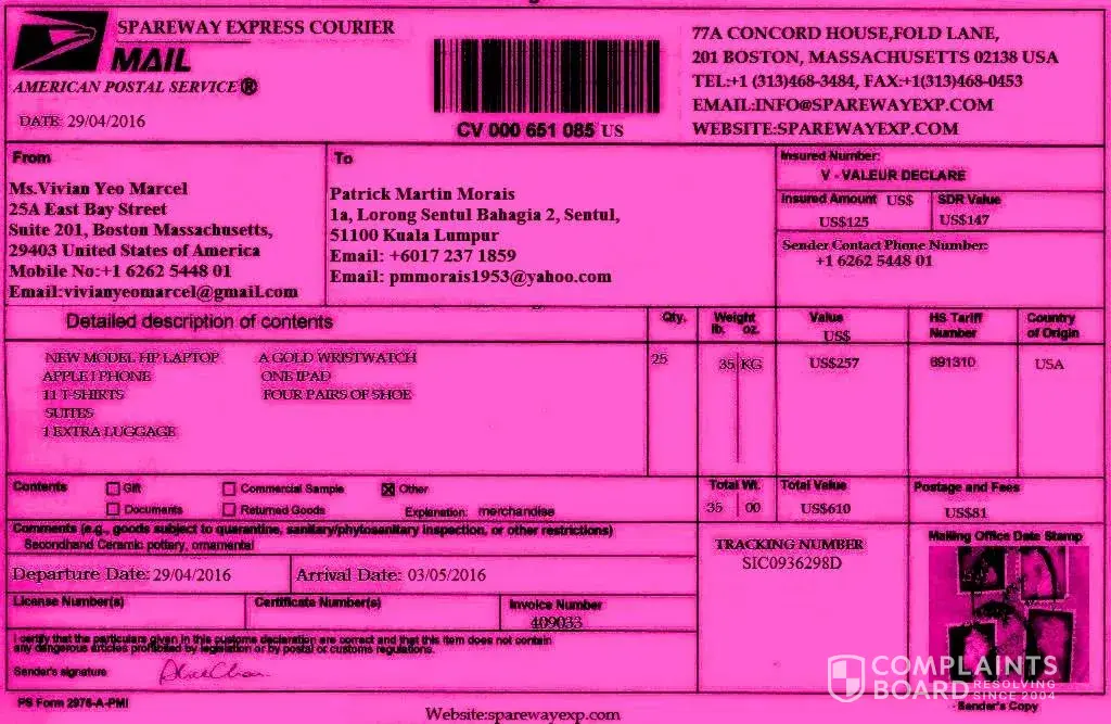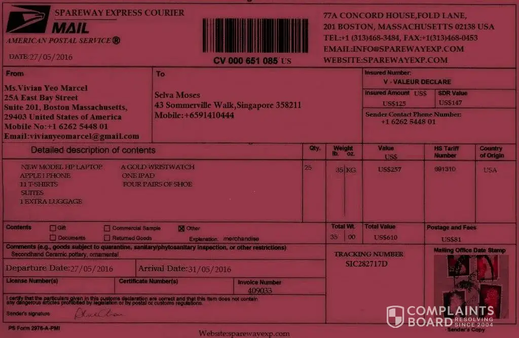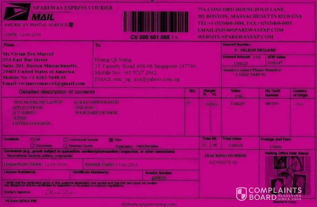 There was this lady whose name is Satram Shantiedebie (Vivian Yeo Marcel) from Boston who has been chatting since APRIL 2016 asking for help to locate his deceased father's address and his death certificate and then she said she wants to buy a property in Singapore knowing, I was from Singapore from my profile. She make up stories everyday with notes & pictures. I do NOT like he approach but i wanted to help her from the bottom f my heart. Meanwhile, she said she has sent a shipment containing some items as per the following attachment and it will be delivered on May 31, 2016 today.