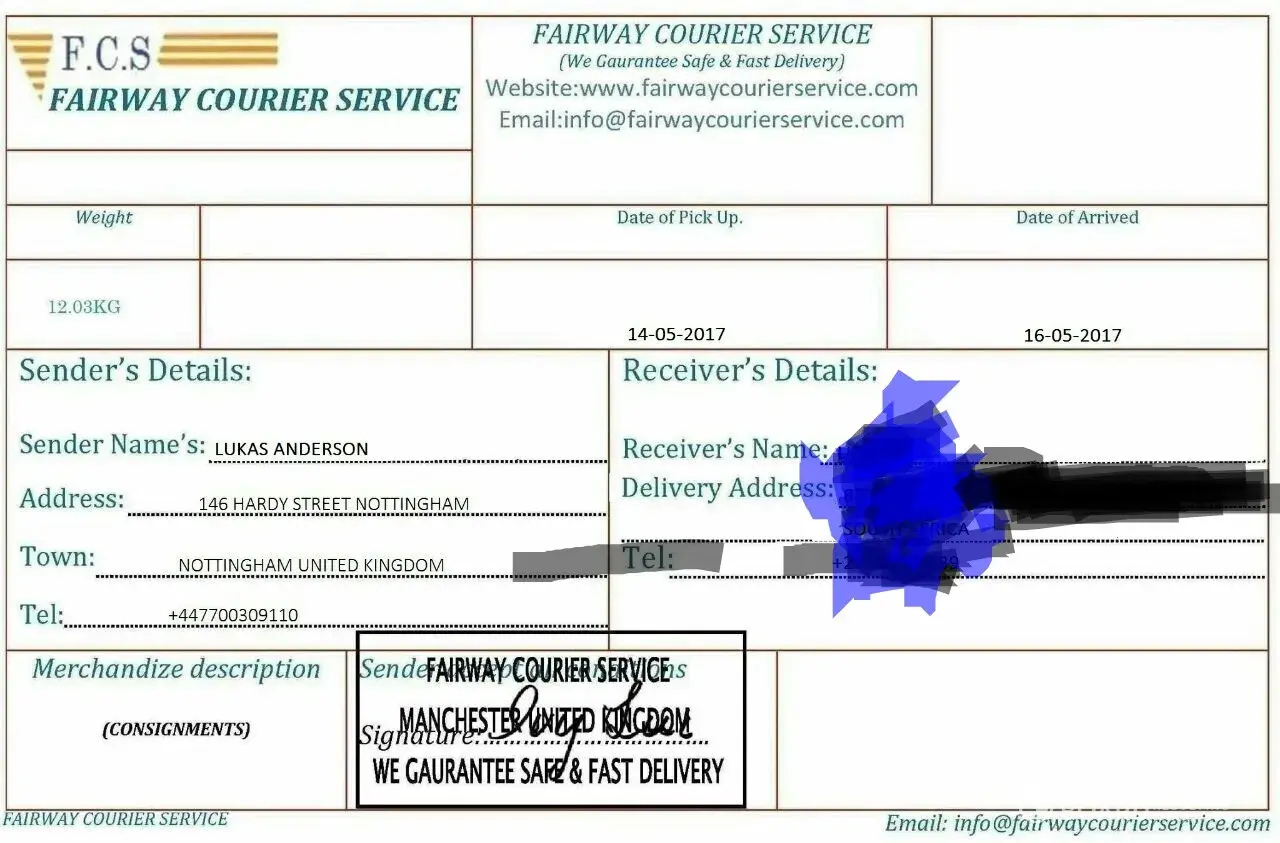 i did not send you this this because I have it too much but is out of love and also for you to know that distance is not a problem, I love you so much . Told him I saw scam message same things like my incident he said There's different between fairways express & fairway courier service, all this scam are on fairway express. But now I want to confirm fairway courier service is a scam, the person I was communicating with was Mike. courier man called they said they gonna refund me before Friday. He said to me his worried about this money if he had enough money he would help me. He only has R5000 after i get that one I can pay him back. I said I don't have money to put on top of that R5000 then he said to me his gonna process my refund papers. I must expect it by Friday which was 10 March 2017. Till today there's nothing, fairway courier service is a scam they are even using the same numbers which are on google. Please please be aware I'm from South Africa. So this scam is everywhere. I have attached the gifts he said he has sent.