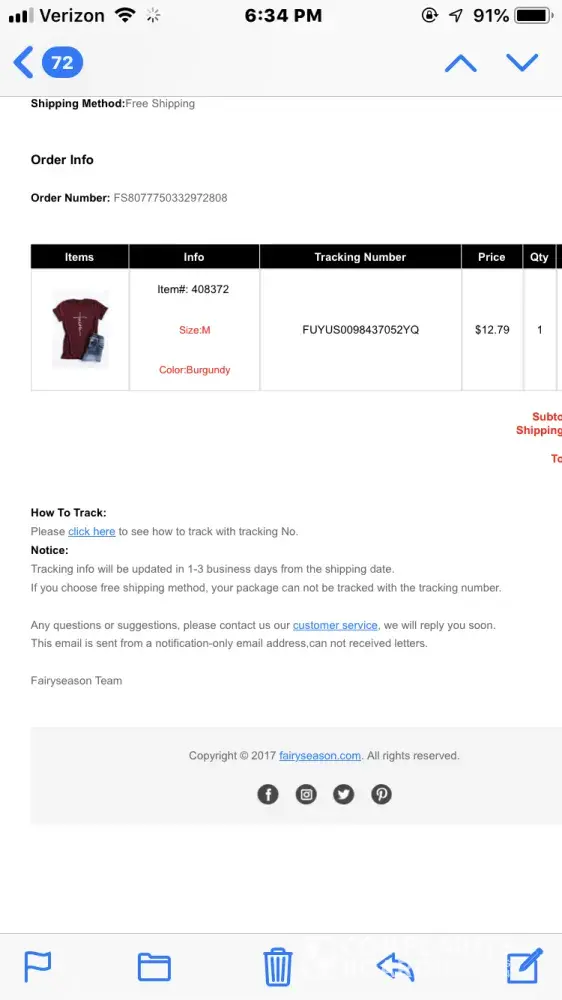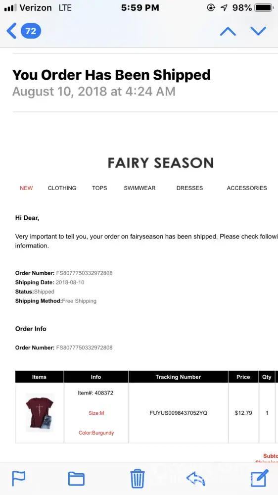 Ordered my clothes with a receipt from PayPal saying PAID but no email confirmations of my order from fairyseason themselves (in which they adhere you'll receive lots of emails confirming your order) with which I received NONE.. bad feeling... Upon not receiving any confirmation, I've emailed and emailed with no response given(although they typically reply the same day) Not pleased as I wanted this outfit for Thanksgiving n don't want to lose my money! Obviously I'm going to but I'll be spreading this news! Best believe it!