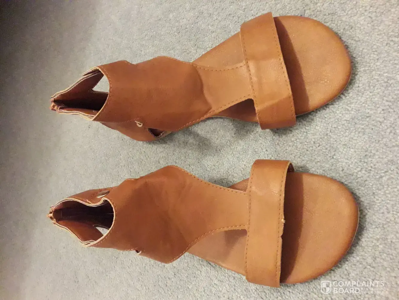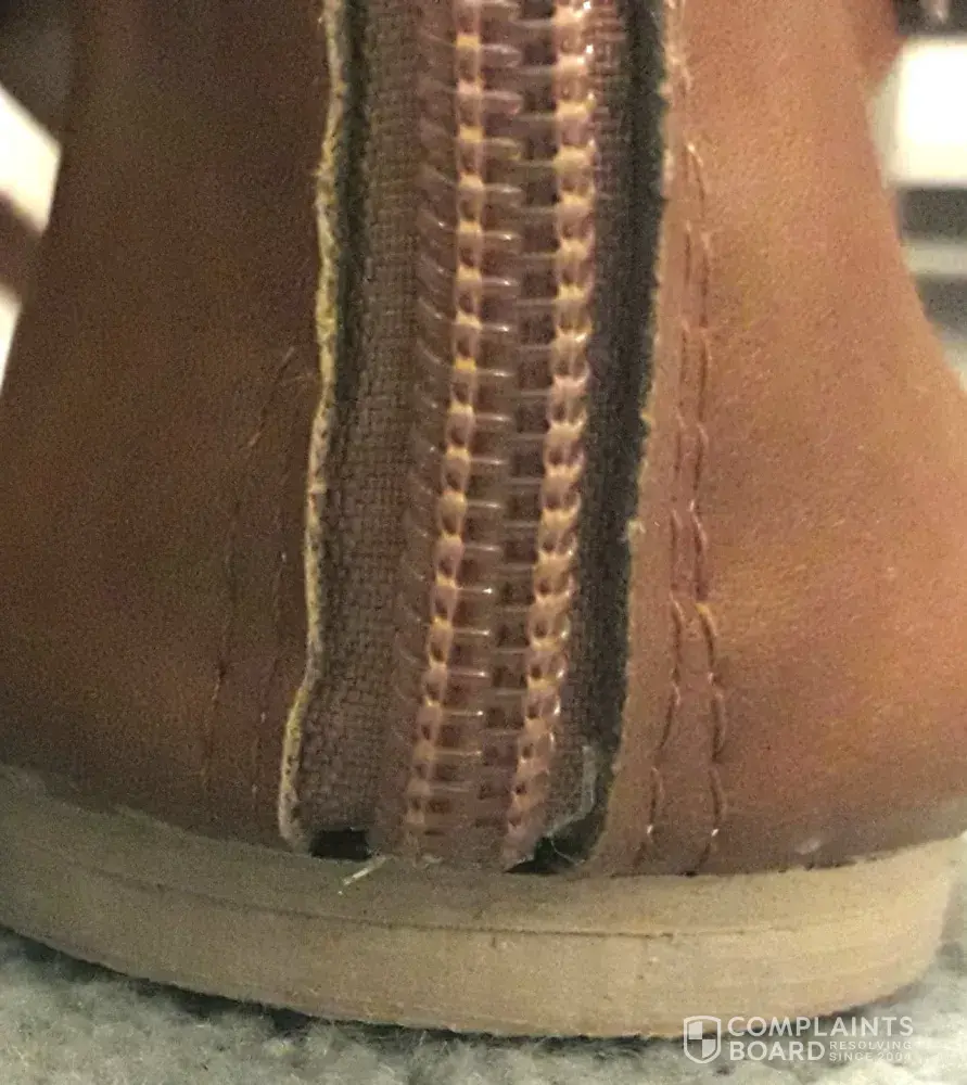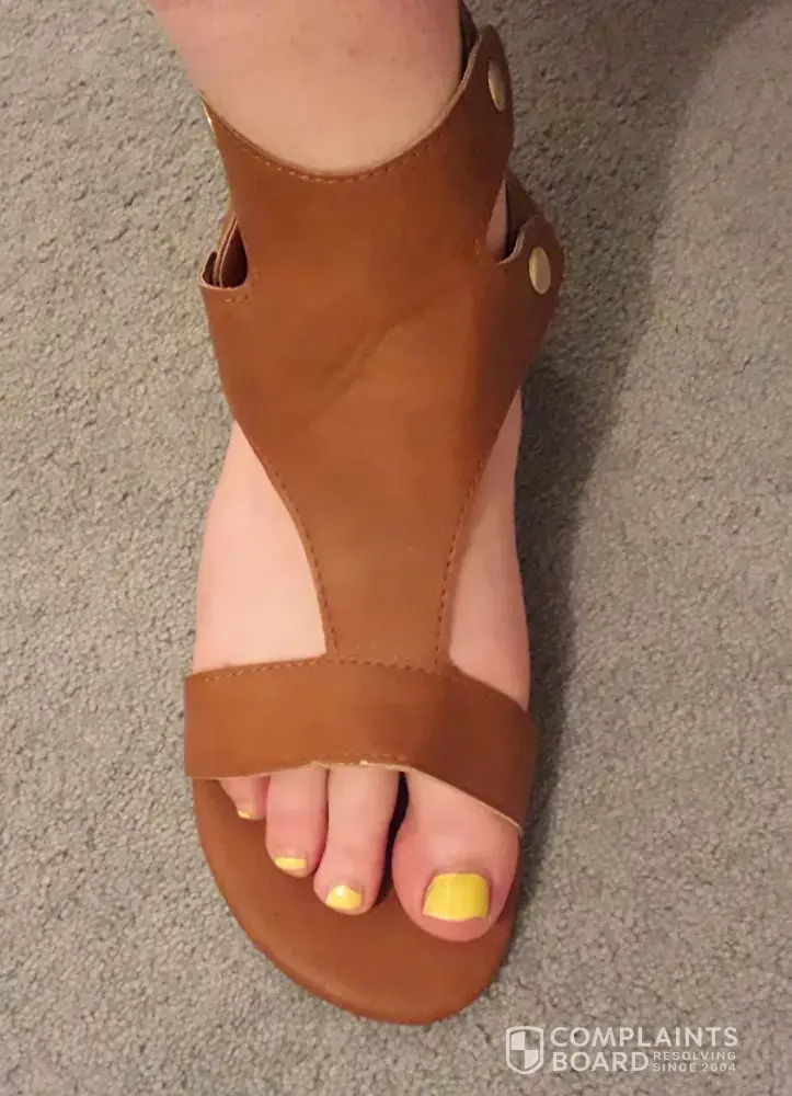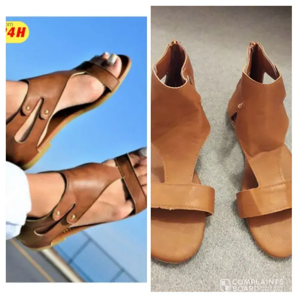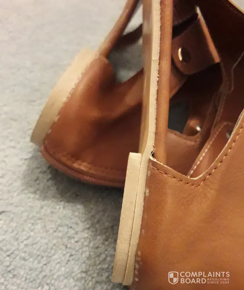Item not as advertised-quality/colour/size different to website pictures and size chart. Item faulty-glue marks around sole/holes at zip base/loose thread/jagged rough edges of un-finished material/toe straps not cut or sewn on straight.