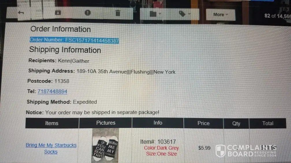 I placed an order # FSC110754036733053 on Dec. 11th. They charged my Credit Card for the full amount. A couple days later I got an email that partial shipment was sent. That was 10 days ago & I can find NO tracking information for the UPS number they gave me that a package is in transit. I have tried to email them THREE TIMES and all I get is an automated confirmation that they received my email & no one ever contacts me. I also PAID EXTRA for "Expedited" shipping & that was 10 days ago! I will now contact PAYPAL AND CANCEL my order. And I will also have to file a Dispute for the charges they put on my Credit Card. DO NOT order from this company!