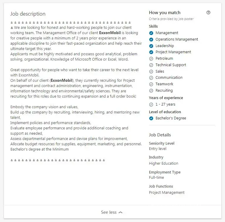 I applied for a job 10 days ago on www.LinkedIn.com with requirements match this fake e-mail received from ExxonMobil recruitment !
