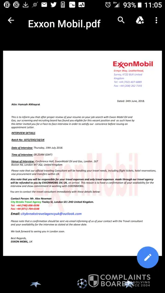3. a 3rd document informing me that I need to work with a specific Travel agency "Crystal travels consultancy and tours emperor house, colliers green, cranbrook kent, TN172LS uk", with a certain consultant: Thomas Cuthbert and with the mention: " Please note that our official travelling Consultant will be handling your travel needs, including flight tickets, hotel reservations, visa procurement and transfers within UK. Also note that you will be responsible for your travel expenses and only travel expenses made through our travel agency will be refunded to you by EXXONMOBIL OIL UK, on arrival. This reason is to have a confirmation of your availability for the interview and show commitment in working with EXXONMOBIL.