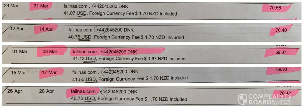 As it turns out, I wasn't the only one to have a negative experience with Falinas. When I called my bank to dispute the charges, they were already familiar with the company and its questionable tactics. It's disheartening to know that Falinas has been able to get away with these practices for so long.