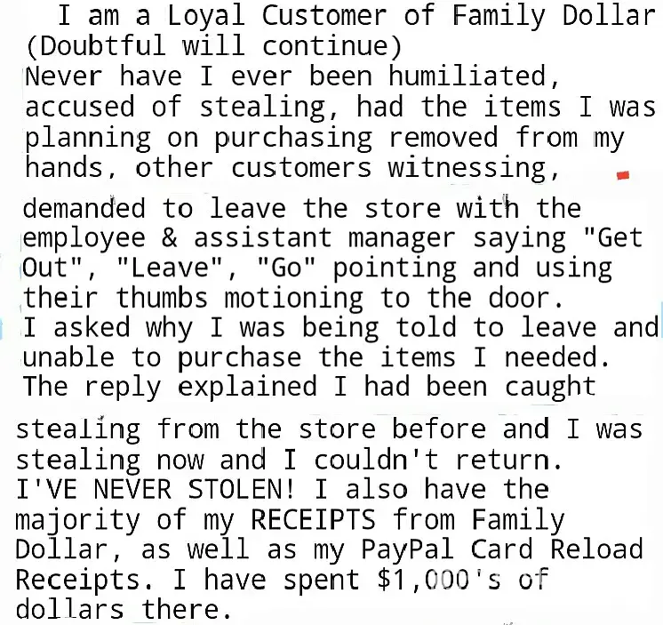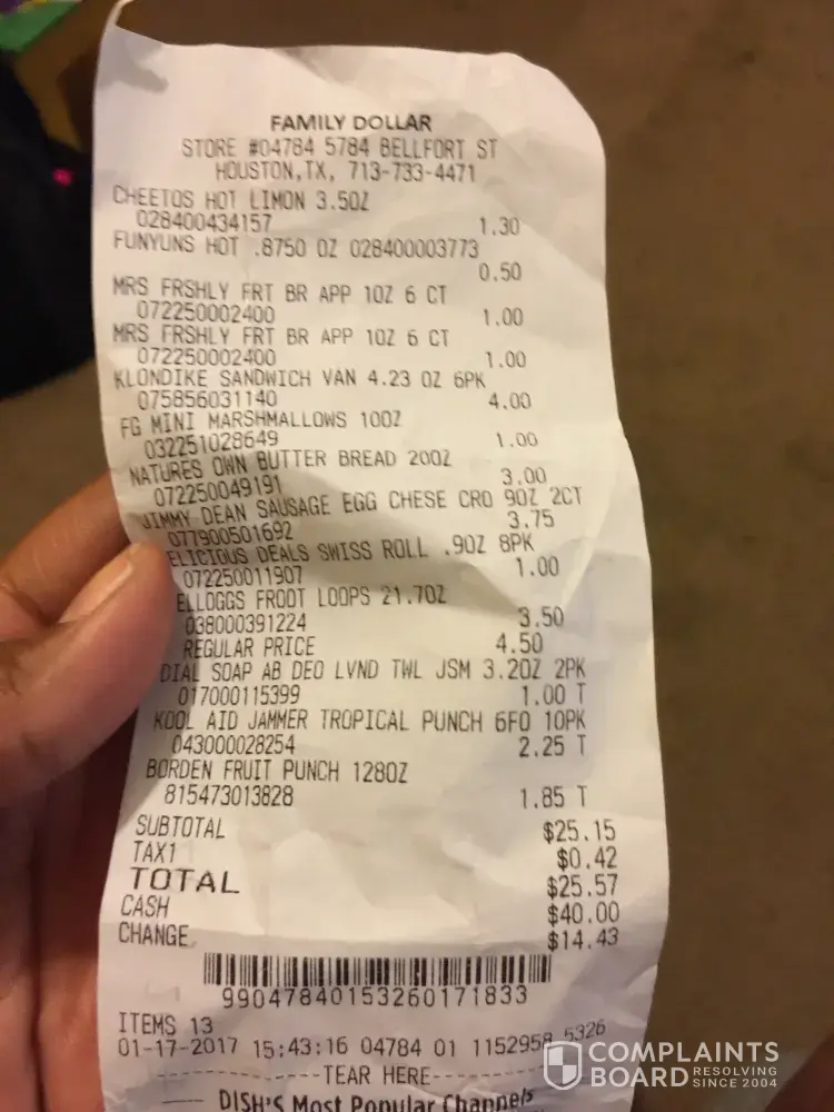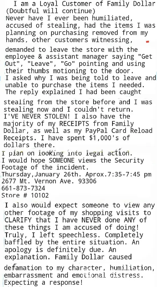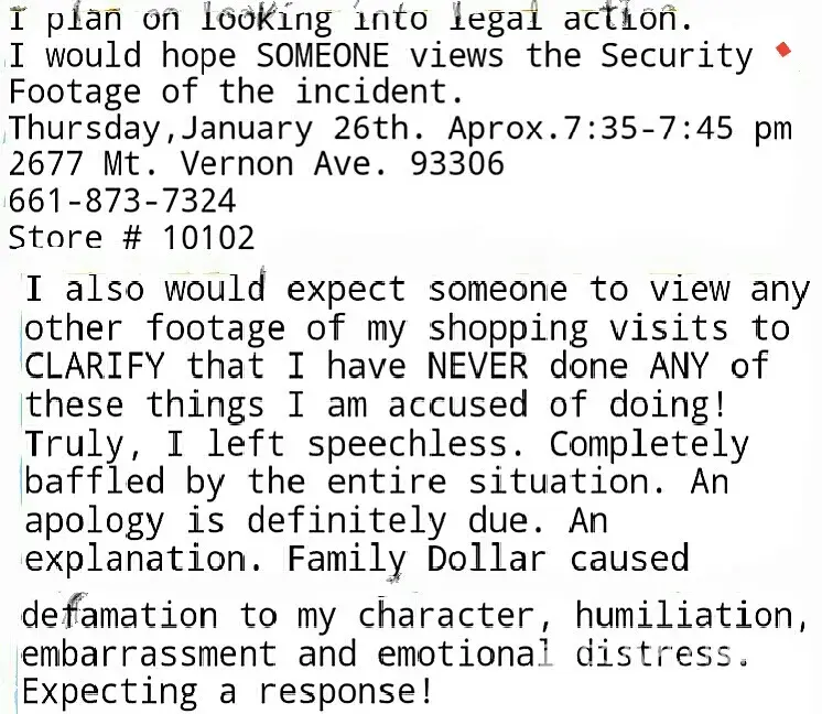 I've tried contacting every possible source within the company (Familydollar) to have a manager, district manager, corporate offices, customer service and the local store itself. Including the asst. Managers, manager.