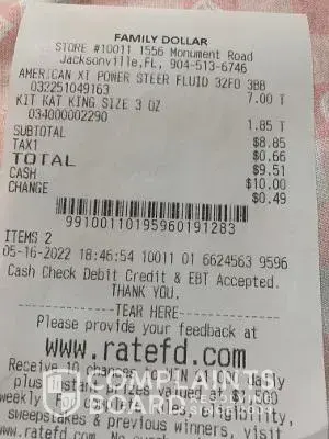 Family Dollar Store 10011 1556 Monument Road Jacksonville FL 32225 On 16 May 2022, During My visit to my local family Dollar, I selected two items from the shelf for purchase. The first item was AMERICAN XT POWER STEERING FLUID 32FO ([protected]). The price marked on the shelf for this product was $5.00. When I got to the register, the Power Steering...
