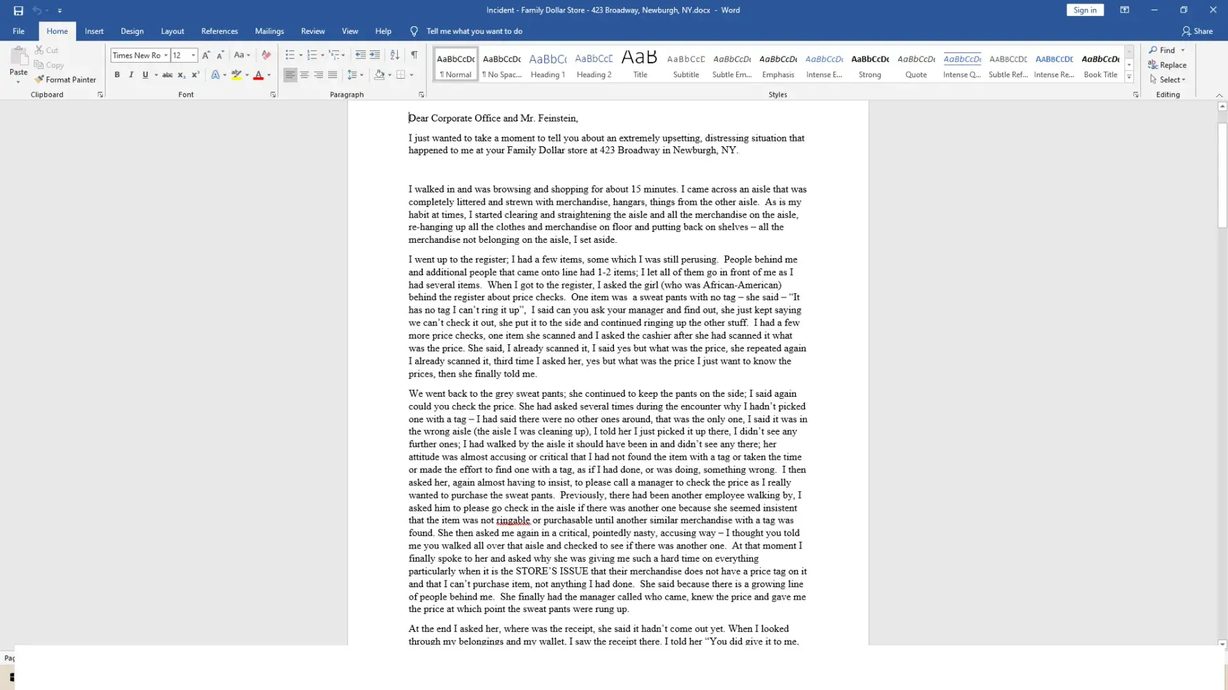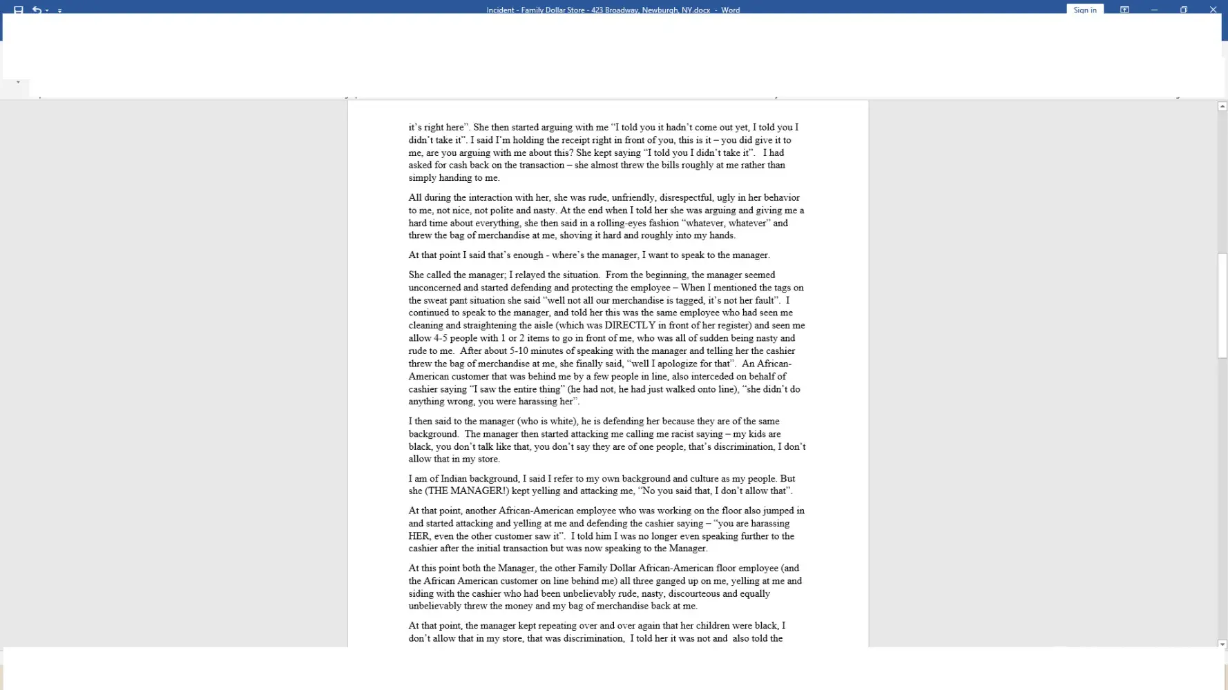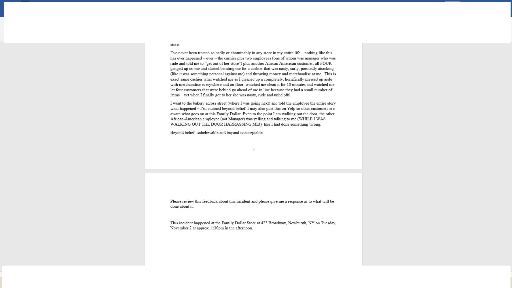 In november of 2021 an incident at family dollar/newburgh occurred which was egregious and outrageous. I reported it to the then dm, brian feinstein who after being aprised of the situation said he would research and get back to me. When I emailed him again, he was always wanting to talk over the phone rather anything in writing over email. Finally when he emailed back he said they take these things very seriously, take time to investigate thoroughly before getting back, this was already about a month after incident. He also informed me there was new dm that he was training and would be the one interviewing and investigating. Another month goes by and I sent email after email (about 4-5 in total) with no response back from him. Finally I called his number and he picked up not knowing it was me - he said matter had been transferred to new dm darwin to handle, he had just forwarded all my emails inquiring about the resolution to him. I also called the corporate office to complain and sent my explanation of the incident in writing to them; they assured me it would be related to the dm, regional manager, etc. It has now been over 6 months - not one word back regarding below incident from anyone at family dollar. Below is the outline of the incident I initially sent to brian feinstein - I was basically mistreated, abused and harrassed by first cashier, then store manager and another employee who jumped in as well as another african american customer on line.