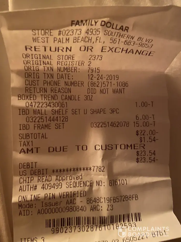 will confirm by the end of this email. But I was treated rudely and disrespected by an employee of family Dollar who would not give me her name. Also the security guy there had a dog inside with him and was standing there didn't offer any help or assistance.