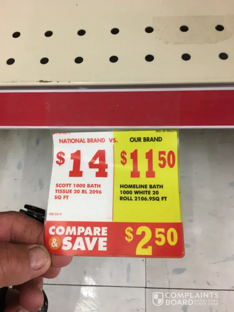 On 09/14/2019 I bought 2 packages of Homeline toilet paper. I got to register and they rang up as 13.50. I said the sign on the shelf said 11.50. The manager walked over and pointed to the sticker on the product and it was 13.50. I paid for it. I sat my purchase down and walked back to where I got it and took a picture. I then found the manager we walked over to the shelf and I showed her the sticker. She said that it was an old sticker and said something which I didn't understand and then said otherwise I could honor it. What is that? Not the way I will do business. I can and will take my business elsewhere if need be. Thank you for your time