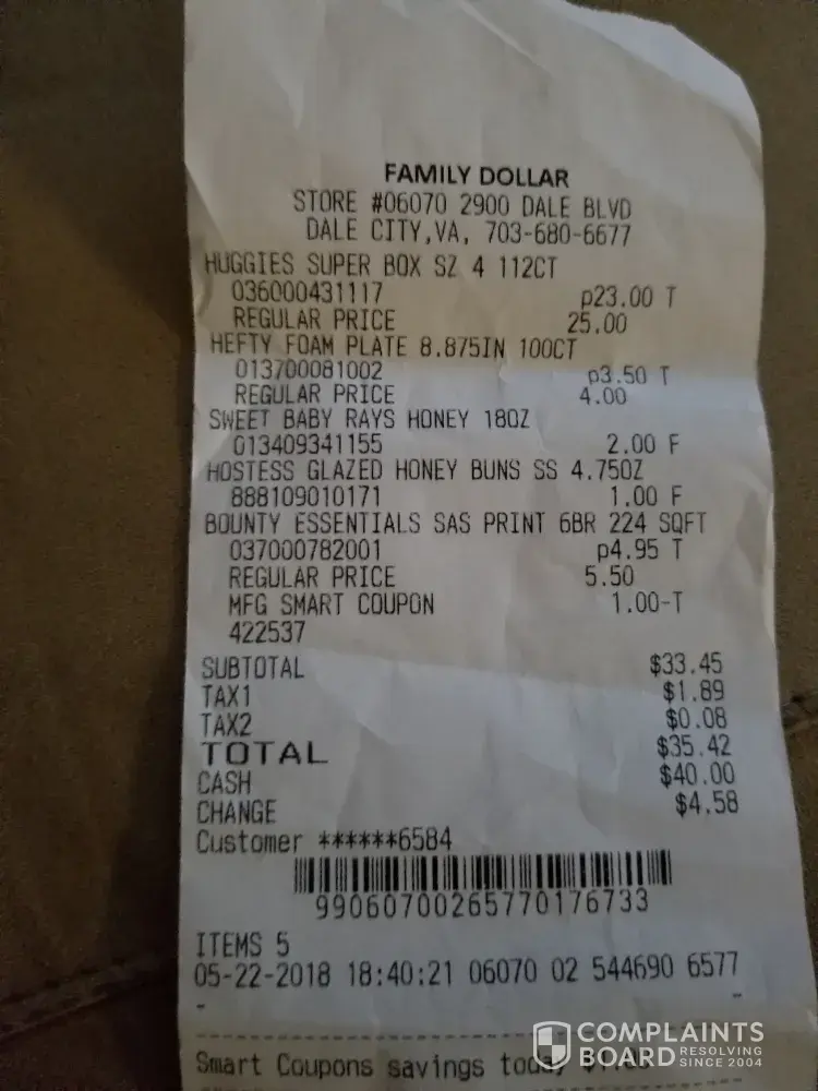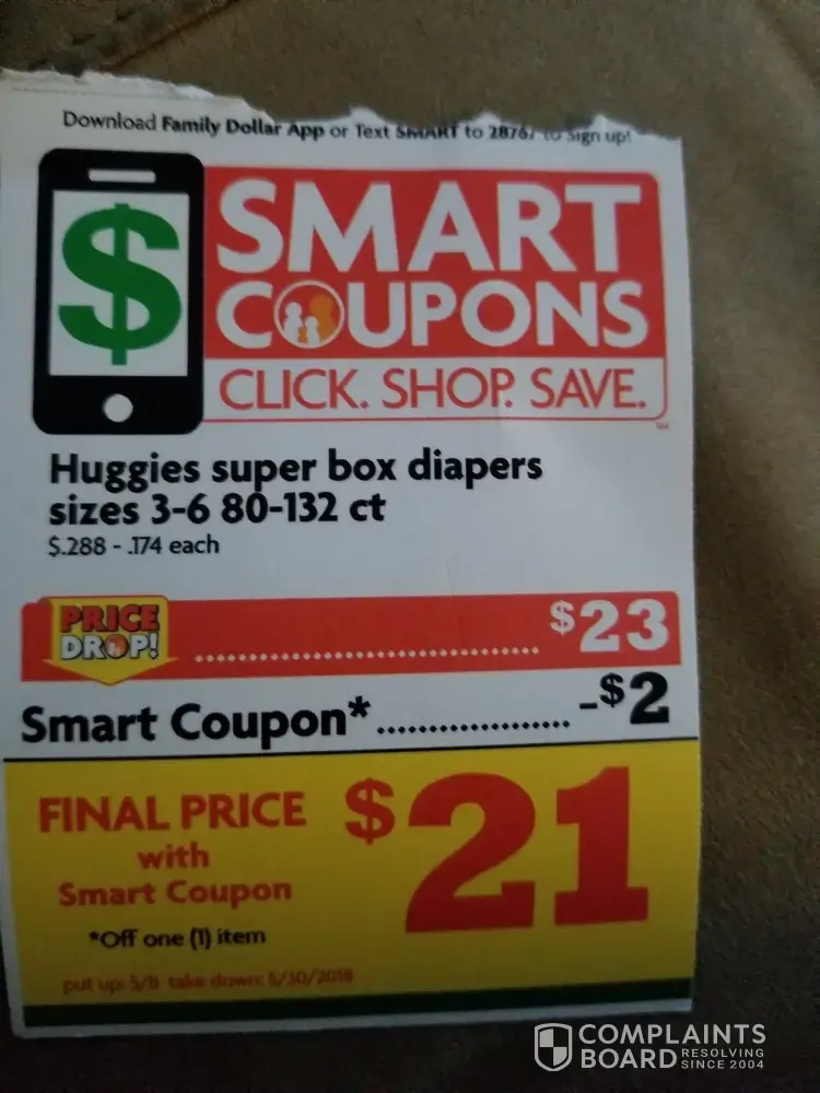 After using my smart clipped/coupons for the advertised discount for huggies diapers, The sales associate ringing up my items, Sherry Crabtree of store # 06070 2900 Dale blvd, Dale City VA 22193, argued, refused to sell me the advertised price for huggies super box diapers sizes 3-6 80-132 ct. The price drop listed at $23-$2 smart coupon final price with Smart Coupon off one (1) item $21. She told me that I had to pay $23 because that is the price that the registered stated. When I showed her the advertised sales tag hanging on the isle, and asked her if she could explain why it stated $21 valid through 5/30/18. The sales associate replied "I don't know" I then asked to speak to the manager so they could explain to me why I was not receiving the sales price because the tag clearly stated $21. Mrs. Crabtree rudely yelled"I am the store manager!" I was shocked that I was hearing this neg reply from a store manager! As the Store Manager she should be able to professionally educated about store ads, etc and to provide exceptional customer service. I did not receive quality customer service from your manager. It is very unprofessional esp, as a store manager to tell a customer that you don't know about products and information in your store which you expect the consumer to purchase, she is not the BEST representation for Family Dollar. When I approached the register to check out I was standing and waiting to be greeted/helped, because she was eating/drinking behind the register. I Love shopping! at FD and the great savings on my certain family/household needs, instead of spending my $ at other larger retailers. But, I have never experience poor service other then this specific store which seems to always be understaffed. I will be giving FD a negative review on yelp and other sites and would like to be refunded for my purchase. This store has been around way too long providing service to communities worldwide to allow this type of manager to lower its standards, and lack of knowledge and poor quality customer service. Attached is the Smart Coupon advertised in the store and my receipt of $33.45. I can be reached at [protected]